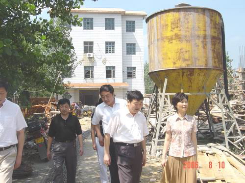 圖為徐成銀場(chǎng)長(zhǎng)陪同周副市長(zhǎng)一行在大壙學(xué)校,察看了解由臺(tái)商捐資正在興建的“明德工程”教學(xué)樓施工情況。