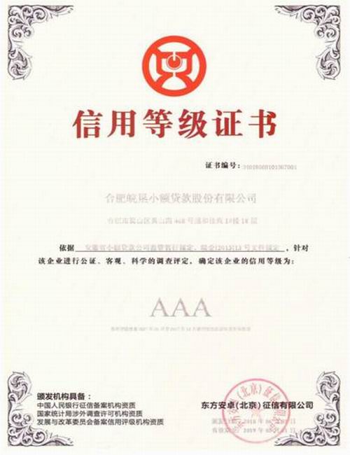 近日,安徽省小貸協(xié)會(huì)公布了2018年全省小額貸款公司監(jiān)管評(píng)級(jí)結(jié)果,皖墾小貸股份有限公司連續(xù)四度獲評(píng)AAA最高信用等級(jí)。