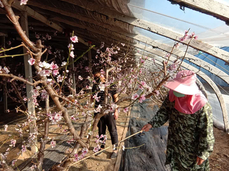 與此同時,在位于江南茶區郎溪縣的農墾十字鋪茶場3萬畝茶園里,茶農們正在對茶樹進行修邊、打頭、施肥,著手做好采茶準備。而在黃河故道旁邊的碭山果園場果樹大棚里,桃花、杏花競相開放,職工正抓緊授粉。種植戶周華萍說,“往年授粉都要雇不少人,今年由于疫情,防止扎堆,沒有雇人,搶抓時間,爭取授上粉,座上果,不減收。”目前果園場800畝大棚果樹大部分已經完成授粉工作。