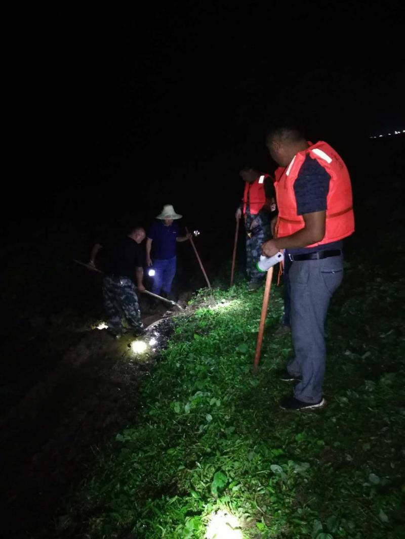 天已經完全黑下來了,堤壩上燈影搖曳,紅旗獵獵。20名隊員迎著夾帶著原野芬芳的晚風,一手拿著木棍或鍬锨,一手拿著高光手電筒,在長200米,寬約50米的范圍內一字排開,“地毯式”仔細排查管涌、滲漏、塌方等堤防隱患。