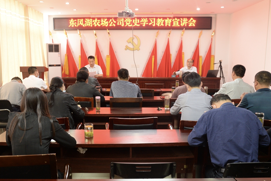 5月13日,安徽農墾集團東風湖農場公司黨史學習教育宣講會在公司會議室舉行。淮南市委宣講團成員黃士軒教授作宣講。公司紀委書記褚鎮主持宣講會。農場公司全體黨員干部、入黨培養對象、積極分子、預備黨員參加會議,聆聽宣講。