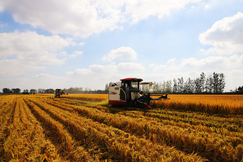 10月14日,潘村湖農(nóng)場公司第二農(nóng)業(yè)分公司統(tǒng)一經(jīng)營田水稻開鐮收割。