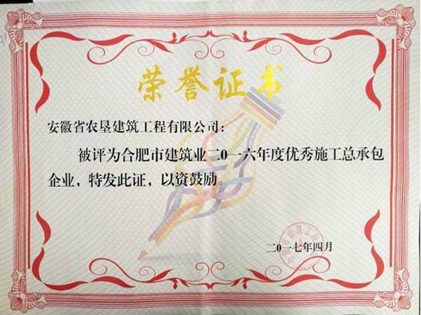 近日,墾建公司榮膺合肥市建筑業2016年度優秀施工總承包企業稱號。這是墾建公司連續第四年獲此殊榮。
