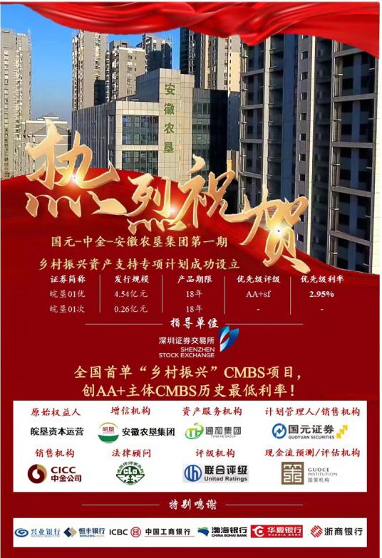 據悉,該項目為全國首單鄉村振興商業房地產抵押貸款支持證券(CMBS)項目,債券總發行規模為4.80億元,其中“皖墾01優”發行規模為4.54億元,發行期限為18年,票面利率為2.95%;“皖墾01次”發行規模為0.26億元,發行期限為18年。債券發行利率創全國AA+主體CMBS 有史以來最低。該項目增信機構為安徽農墾集團,原始權益人和資產服務機構分別為安徽農墾集團下屬的皖墾資本運營公司、通和集團公司,計劃管理人為國元證券股份有限公司。
