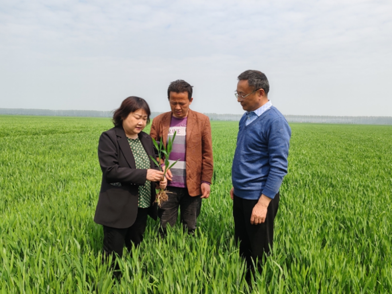4月10日,王玉葉(左一)在壽西湖農(nóng)場(chǎng)公司調(diào)研指導(dǎo)一噴三防,查看小麥長(zhǎng)勢(shì)。