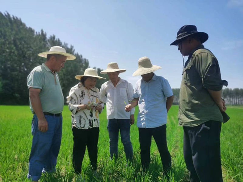 2023年7月19日,王玉葉(左二)指導(dǎo)水稻分蘗期田間管理。