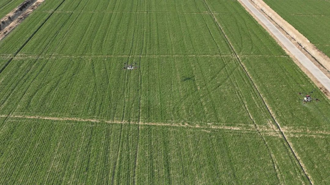 2月28日,在安徽農墾龍亢農場農業二場4號地塊,兩架無人機正在進行小麥雨前追肥作業。今年該場2.2萬畝小麥全部實行無人機施肥。