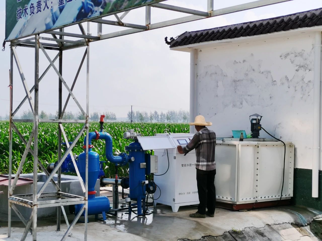 7月26日,在夾溝農場第三生產區玉米地里,剛剛畢業的碩士研究生盧良濤正在操作智能水肥一體機,注水、加肥、攪拌、分流等環節“一氣呵成”。面對近期持續的高溫旱情,該場試驗推廣的2000畝玉米水肥一體化技術成效凸顯,目前田間玉米長勢良好。