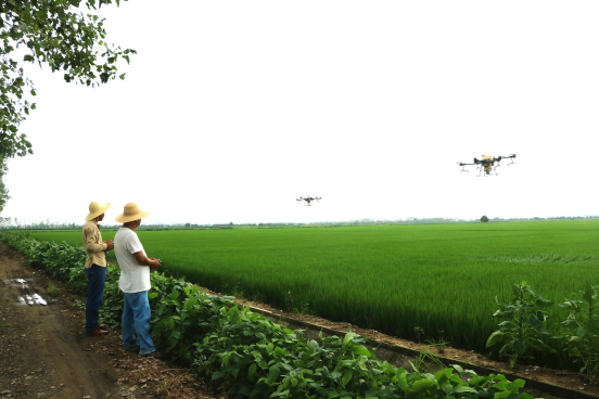 ▲皖河農場用無人機為“千畝方”田進行病蟲害防治