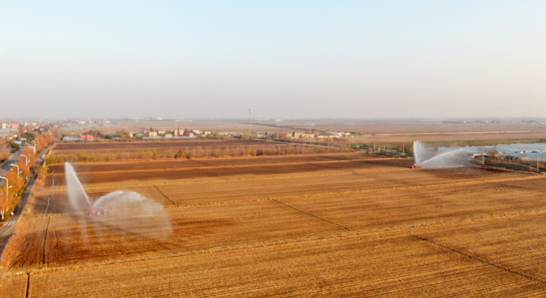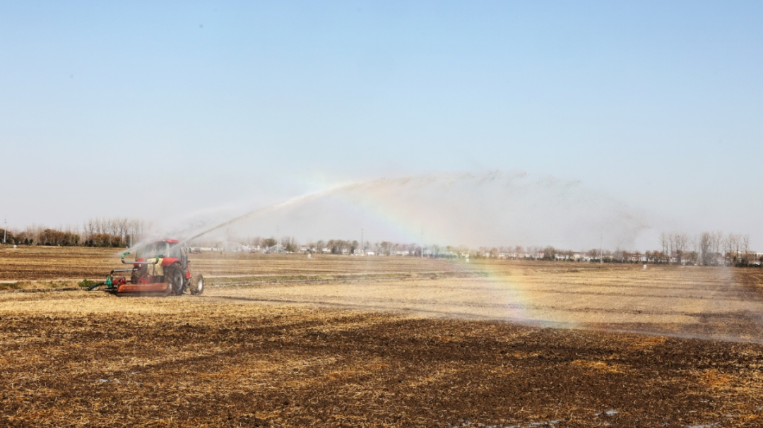 華陽河農場針對部分晚稻茬小麥土壤墑情不足的情況,迅速組織噴灌抗旱,實施精準補水,確保稻茬麥齊苗越冬。(李龍)