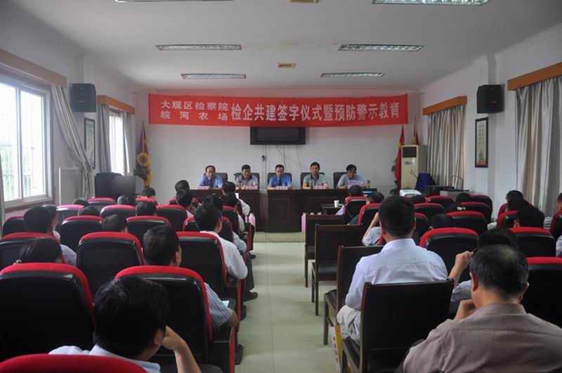 618,皖河農場黨委與安慶市大觀區檢察院聯合舉行檢企共建預防職務犯罪平臺簽約儀式暨預防警示教育活動。區檢察院院長吳才廣、副院長何天錫和場領導趙軍、胡興兵、汪丙來、徐和興、徐英晴、占美能出席,農場各部門單位黨政負責人、會計人員參會。