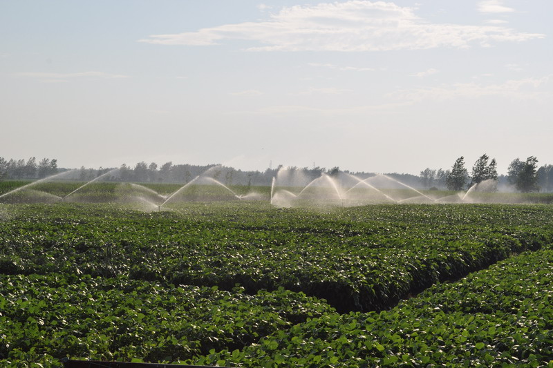86,位于明光市的安徽農(nóng)墾潘村湖農(nóng)場,自動灌溉設(shè)備正在澆水。連日高溫晴熱,當(dāng)?shù)睾登轱@現(xiàn),該農(nóng)場組織灌溉機械抗旱澆水,力保3萬余畝在地作物墑情充足。(安徽日報20138701版,本報通訊員楊登宏攝)