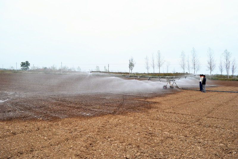 1024,安徽農(nóng)墾潘村湖農(nóng)場(chǎng)二分場(chǎng)的職工家庭農(nóng)場(chǎng)正利用大型絞盤式噴灌機(jī)為麥田澆水。針對(duì)今年秋種以來(lái)出現(xiàn)的持續(xù)無(wú)雨天氣,該農(nóng)場(chǎng)的職工家庭農(nóng)場(chǎng)利用各種灌溉設(shè)備為已播小麥的大田澆水,確保苗齊苗壯、安全越冬。(安徽日?qǐng)?bào)20131026A2版,楊登宏攝)
