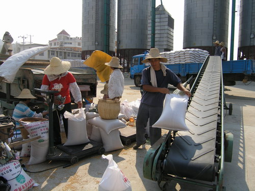 潘村湖農場今年可向社會提供優質小麥良種3000萬斤.自7月中旬以來,該場小麥種子銷售進入旺季,四方新老客戶紛至沓來,企業呈現產銷兩旺的喜人局面.圖為種子公司員工正在將該場出品的小麥良種包裝后裝車外運的情景.(楊登宏攝)