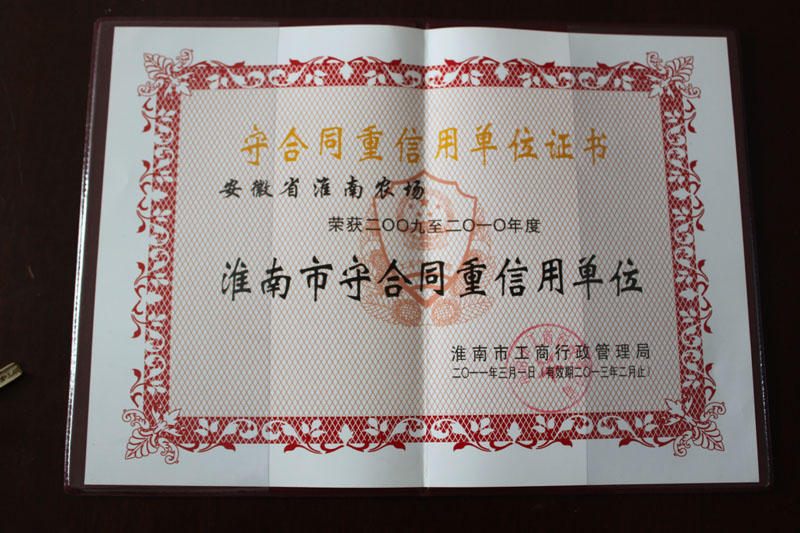 淮南農(nóng)場連續(xù)六年獲市級“守合同重信用單位”稱號
