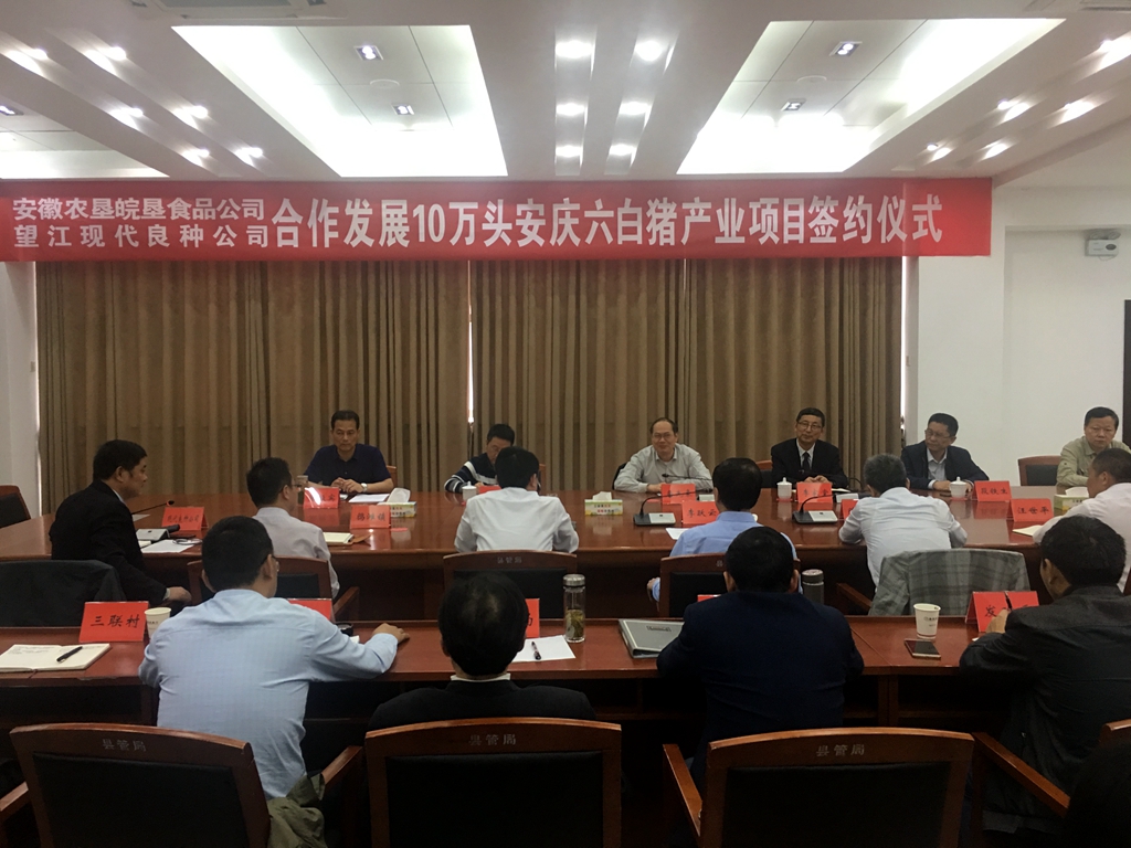 4月24日,安徽農墾皖墾食品有限公司與望江縣現代良種養殖有限公司合作,發展10萬頭安慶六白豬產業項目簽約儀式在望江縣政府隆重舉行。省農墾集團黨委書記、董事長詹先豪,副總經理李家堂,望江縣縣委書記李躍云,縣長霍輝、縣委常委、副縣長陳春來,副縣長汪世平,省生豬產業體系首席專家、安農大教授殷宗俊等出席簽約儀式。