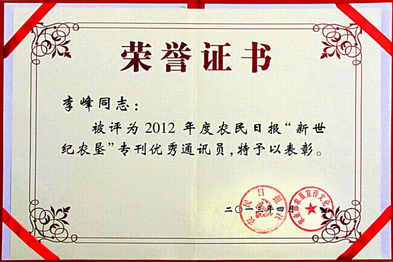 皖墾食品集團宣傳干部李峰同志熱愛本職工作,勤于筆耕,質量上乘的宣傳稿件不斷在農民日報和中國農墾雜志上發表,日前被上述兩家報刊聯合評為2012年度優秀通訊員。(鮑廣云)