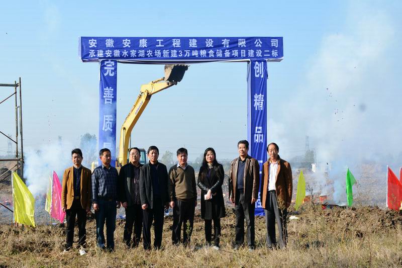 115,水家湖農場3萬噸糧食儲備庫項目動工開建,農場領導及相關部室、監理、施工單位負責人到場督查。