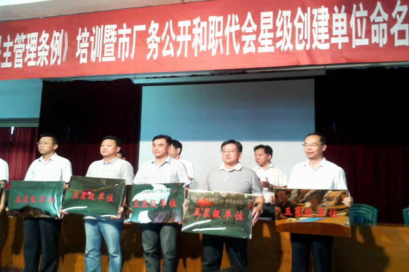 近年來,皖墾食品集團工會有組織、有計劃、有步驟地推進場務公開民主管理工作,成立領導小組,制定實施方案,明確目標任務,各項工作舉措落實到位。今年繼榮獲蚌埠市2013年度廠務公開民主管理先進單位之后,日前,又被市總工會授予“2013-2014年度全市廠務公開和職代會五星級單位榮譽稱號。(李峰)