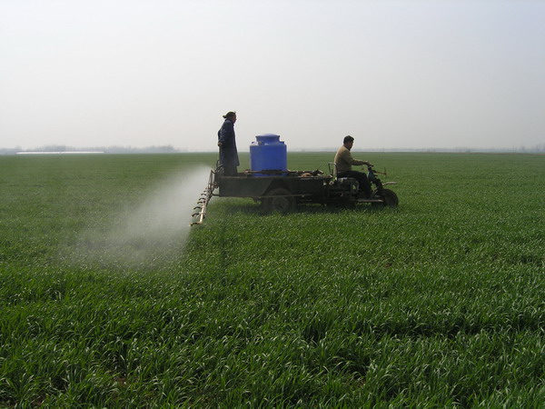 針對今年特殊的暖冬氣候,潘村湖農場從2月下旬開始組織家庭農場農場開展了以“控長促壯,以控為主”為主要內容的早春小麥田間管理工作,為2007年度實現“萬畝千斤”小麥高產攻關目標奠定了扎實基礎。連日來,廣大家庭農場職工抓住晴好天氣,根據小麥苗情、土壤墑情及病蟲草害監測情況,在場農技人員的指導下,將控長、促壯、防病、治蟲、除草結合起來集中落實田管技術措施,做到節本高效,一步到位。到3月13日,全場3.2萬畝小麥已有90%的地塊施行了這種俗稱“一炮轟”的田管措施。圖為該場一分場職工正在進行機械化藥劑噴施作業的場景。(楊登宏)