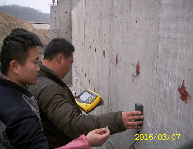 37,白米山農場領導邱達、王陽春一行走進金條洪水庫除險加固項目現場,檢查了工程進度與質量,并邀請滁州市水利質檢站技術人員對箱涵主體進行強度檢測,結果顯示達到了各項技術要求。同步實施的月牙湖水庫除險加固工程正在進行壩體灌漿加固,預計本月中旬即可完工。