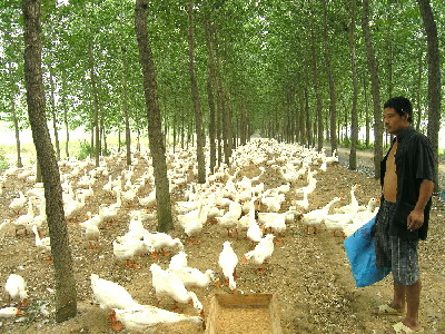 今年38歲的田益成是安徽省潘村湖農場第二管理區職工,他在種好承包田的同時,積極發展養殖業。今年,該戶家庭農場可出欄優質大白鵝1萬只,預計獲利15萬元。圖為田益成正在飼鵝的情景。(楊登宏)