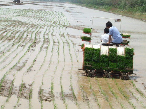 方邱湖農(nóng)場(chǎng)種子公司大面積推廣機(jī)插秧走過了育秧、整地階段,今天正式開始插秧。上午,在有關(guān)技術(shù)人員的指導(dǎo)下,新購置的乘坐式“洋馬”插秧機(jī)輕盈地飄行在秧田里,身后留下了一行行蔥綠的秧苗。第一家開始插秧的家庭農(nóng)場(chǎng)職工徐新芳夫婦小心地幫著搬秧運(yùn)秧,喜悅的心情時(shí)不時(shí)的從略顯緊張的臉上流露出來。據(jù)現(xiàn)場(chǎng)的技術(shù)人員介紹,如果工作環(huán)節(jié)協(xié)調(diào)好,一臺(tái)插秧機(jī)一天可插秧百畝以上,按照這個(gè)速度三~四天就可完成全部插秧任務(wù)。(邱緒恒)