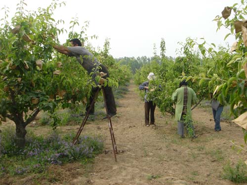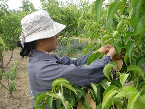 自2002年以來,碭山果園場為適應(yīng)市場的需求,優(yōu)化品種結(jié)構(gòu),大力進(jìn)行產(chǎn)品結(jié)構(gòu)調(diào)整,高接日韓圓黃、黃冠等“洋梨”近2000畝,至2007年已全部進(jìn)入盛果期。日韓“洋梨”不套袋似“丑小鴨”,又黑又粗;套上袋似“白天鵝”,又白又細(xì)。貨賣一張皮,不套袋的“洋梨”出園價約0.8元/公斤,套袋的“洋梨”出園價約2.5元/公斤,價格懸殊很大。2007年,該場發(fā)布“洋梨”套袋總動員,并提供技術(shù)指導(dǎo)服務(wù),聯(lián)系套袋,職工積極響應(yīng),踴躍套袋。至5月23日,全場已套袋梨園面積1800畝,使用套袋720萬只,可生產(chǎn)優(yōu)質(zhì)“洋梨”400多萬斤,幫助職工增收上百萬元,有力地促進(jìn)了我場現(xiàn)代農(nóng)業(yè)的發(fā)展。