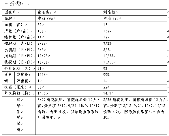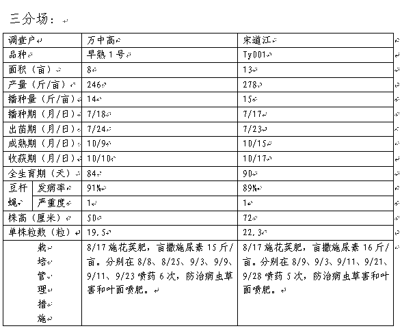 2.由農(nóng)科所組織2-3名技術(shù)人員,定期通過田間觀察和職工口述,詳細(xì)調(diào)查補(bǔ)種典型戶的生產(chǎn)管理情況和補(bǔ)種大豆生育特點(diǎn)。