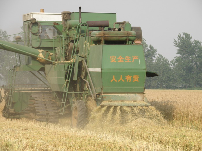5月31日,在大壙圩農場午收現場,安裝了秸桿粉碎裝置的大型“東風”收割機正在邊收割邊進行小麥秸桿粉碎,同時還有一臺大馬力輪胎車緊隨其后進行滅茬粉碎還田(見圖)。