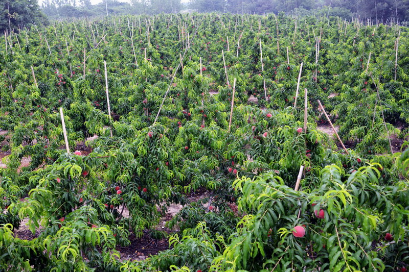 2013年以來,農場引進借力種植大戶,引領帶動職工種桃,選用早熟豐產的優質良種,密植栽培,科學管理,當年定植,次年掛果,早見效益,目前全場種植良種桃近3000畝,近日千余畝開園采摘上市。走進桃園,紅桃滿目、綴滿枝頭,一派誘人的豐收景象,超紅、春蜜、春梅、春雪和以色列早紅、黃金蜜、滿園紅等十多個毛桃油桃良種均已成熟,預計產量超百萬斤。