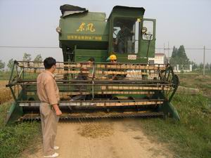 潘村湖農場今年午季小麥良種化率達到100%%。為確 保種子質量,該場采取多種措施,防止種子糧之間 因為人為原因混雜。圖為場農技人員正在清掃轉場 作業的收割機。(楊登宏攝)