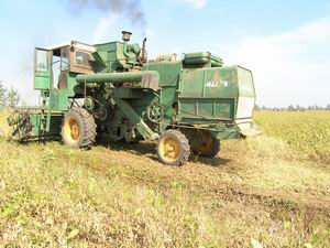 圖片說明:為改良土壤,培肥地力,提高農作物產 量水平,安徽省潘村湖農場撥出10萬元專款,在今 年秋收中大力推廣大豆秸桿還田技術。全場3.2萬 畝大豆收獲后,全部實現了秸桿還田。圖為帶有秸 桿粉碎裝置的大馬力收割機正在田間作業。(楊登 宏)