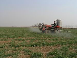 進入3月份以來,潘村湖農場廣大職工家庭農場不失 時機地做好小麥田管工作,為今年午季再獲豐收夯 實基礎。圖為種子公司原種場職工正在實施田間噴 藥場景。(楊登宏攝)