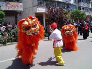 5月6日,龍亢農(nóng)場(chǎng)夕陽(yáng)紅藝術(shù)團(tuán)組織一支40多人組成 的表演隊(duì),參加安徽省懷遠(yuǎn)縣第十四屆花鼓燈藝術(shù)節(jié) 的踩街活動(dòng),受到沿街?jǐn)?shù)萬(wàn)名觀眾的贊揚(yáng).圖為藝術(shù) 團(tuán)在表演獅子。(王戴群)
