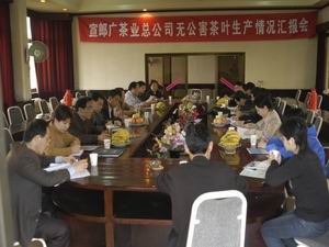 4月18日,宣郞廣茶業總公司邀請省農委、安徽農業 大學的茶葉專家教授和農業中央駐皖和省內主要媒 體進行座談,匯報本公司茶葉夫公害生產情況,并 向公眾承諾,到明年,全公司2萬畝茶園將全部實行 統防統治。