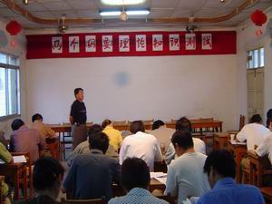 8月5日上午,龍亢農場黨委組織全場各黨總支、支 部書記及副科以上干部近40人參加兩個<<綱要>>理 論知識測試。經批閱,參試人員的平均分達98.25 分。(圖為考試現場)