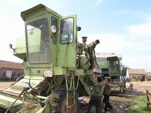 為迎接即將到來的“三夏”戰役,潘村湖農場及早 做好農機具的檢修工作。圖為七分場職工正在對聯 合收割機進行保養檢修。(楊登宏攝)