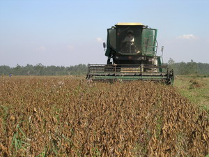 10月8日上午,艷陽(yáng)高照,秋色正濃.在潘村湖廣褒的 原野上,機(jī)械轟鳴,車來(lái)車往,2005年秋收會(huì)戰(zhàn)全面 打響了.在三分場(chǎng)8號(hào)地北,3臺(tái)大型聯(lián)合收割機(jī)來(lái)回 穿梭,已經(jīng)熟透的大豆隨著收割機(jī)的傳送裝置一路 歡唱著奔向機(jī)倉(cāng).不到半天時(shí)間,這一塊大田就基本 收割一空.曬場(chǎng)上,一車車金燦燦的大豆運(yùn)來(lái)了,婦 女們麻利地卸糧攤曬,大伙邊勞動(dòng)邊拉呱,十分熱 鬧.分場(chǎng)領(lǐng)導(dǎo)分片負(fù)責(zé),檢查作業(yè)質(zhì)量,維持收割秩 序,協(xié)調(diào)收割和運(yùn)輸機(jī)械,時(shí)時(shí)提醒職工不忘安全生 產(chǎn).8日一天,全場(chǎng)投入收運(yùn)機(jī)械近300臺(tái),到下午5 時(shí),收獲大豆7190畝,加之前期收獲部分,已經(jīng)完成 收割任務(wù)的44%%.9日開始,秋收進(jìn)入高潮階段,全場(chǎng) 僅各型收割機(jī)就投入近200臺(tái),汽車、輪式拖拉機(jī)等 運(yùn)輸車輛300多輛,各家庭農(nóng)場(chǎng)除老弱病幼外悉數(shù) 上陣,全力以赴戰(zhàn)秋收。至11下午,全場(chǎng)3.2萬(wàn)畝全 部收割完畢,圓滿完成了今年秋收任務(wù)。