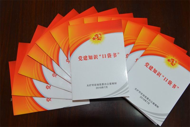 為深入學習貫徹習近平新時代中國特色社會主義思想和黨的十九大精神,近日,大壙圩農場黨辦編印《黨建知識“口袋書”》,分發給全場黨員,人手一冊,方便黨員學習?!饵h建知識“口袋書”》突出黨的政治理論,精選了黨的基本知識、十八大和十九大報告、習近平新時代中國特色社會主義思想等知識,內容簡潔明了、便于記憶掌握,讓黨員們可充分利用工作間隙和業余時間,隨時隨地查閱學習,讓黨的最新理論成果既進口袋、又入腦袋,成為全場黨員武裝頭腦、指導實踐的必備“法寶”。