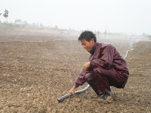針對秋種以來日益顯現(xiàn)的旱情,潘村湖農(nóng)場廣大家 庭農(nóng)場職工不等不靠,奮力抗旱促苗.圖為二分場職 工正在田間采用微孔噴灌技術(shù)抗旱促苗.(楊登宏)