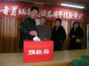 目前,向賈丙英、趙保忠母子獻愛心捐款活動仍在 進行中。圖為機關工會組織向賈丙英母子捐款活動 情景.(楊登宏)