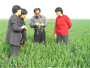 龍亢農場依靠科技抓田管,定期組織科技人員深入 家庭農場指導生產,并將田管措施和病蟲害防治印 發成冊下發到每個家庭農場,將春季田間管理落到 實處。(圖為科技人員在指導田管)(龍亢農場場 長工作部 王戴群)