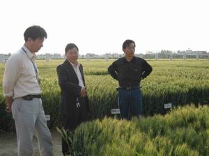 河南省地神種業公司總經理陳清林于5月29日在潘 村湖農場考察合作項目運行情況.隸屬于河南省黃 泛區農場的地神種業公司是全國種子行業50強之 一,由該場研發的神麥2號(即原泛麥5號)是具有抗 寒、抗病、抗倒、多穗等特點的超高產新品種。從 2005年底開始,潘村湖農場與地神種業強強聯手, 相互合作,由潘村湖農場獨享神麥2號在皖東、皖 北和江蘇的經營權。由地神種業輸入種源和相關栽 培技術的潘村湖農場2000畝神麥2號小麥長勢喜 人,豐收在望,據田間測產,平均單產達500公 斤。圖為在副場長李先金(右)陪同下,陳清林總 經理(中)在良種繁育基地察看神麥2號生長情況 的情景。(楊登宏)